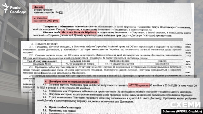 У тому ж таки квітні 2023-го вона також купує майнові права на квартиру площею 78 квадратів нібито за 670 тисяч гривень. Ринкова вартість таких апартаментів, на той момент, – майже 6 мільйонів гривень.