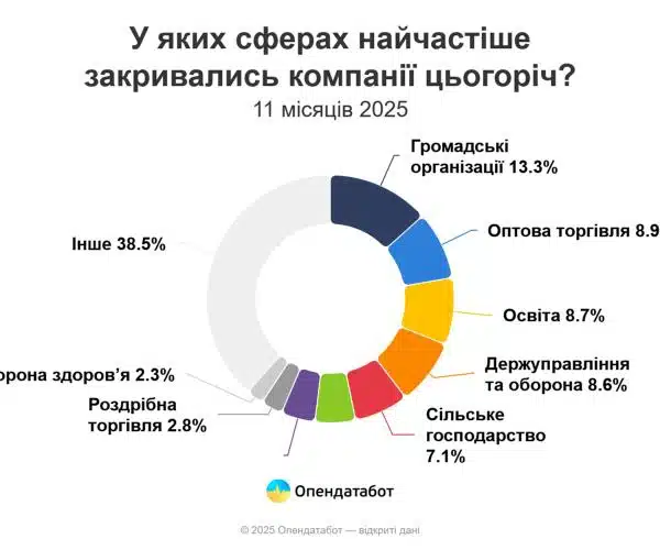 За 11 місяців 2025 року з мапи України зникло понад 11 тисяч компаній. Найчастіше діяльність припиняли у Києві, на Дніпропетровщині та Львівщині, а найбільш уразливими виявилися громадські організації. Про це повідомляє Опендатабот, пише УНН.