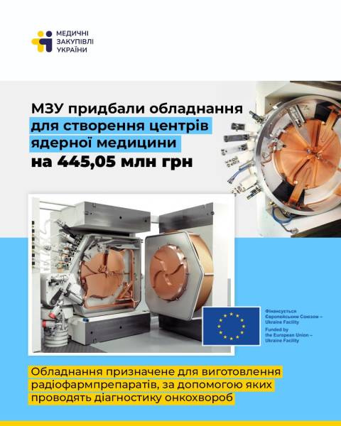 Зазначається, що закупівля фінансується Європейським Союзом за допомогою інструменту Ukraine Facility. Загальна сума договору з ПДВ склала 445,05 млн грн. Йдеться про ключові позиції обладнання, такі як циклотрон для виробництва радіоізотопів, а також обладнання для лабораторії, де на основі отриманих ізотопів виготовлятимуться радіофармпрепарати: камери автоматичного синтезу та мультитрейсерні системи. Вони гарантують точне дозування й безпечне виробництво препаратів для введення в організм пацієнта для сканування на позитронно-емісійній томографії з комп’ютерною томографією (ПЕТ-КТ).