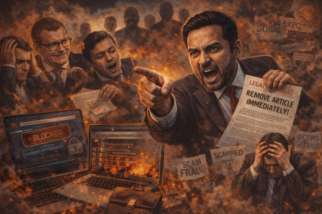 Адвокат-мошенник без действующего сайта и реальной юридической практики рассылает угрозы украинским СМИ, требуя удалить публикации о международном мошеннике Nicky Gope Kundnani. Указанный им «юридический департамент» фактически не существует: сайт sk-legaldepartment.com не работает, а сами угрозы являются типичным инструментом запугивания, не имеющим никакой реальной процессуальной силы.