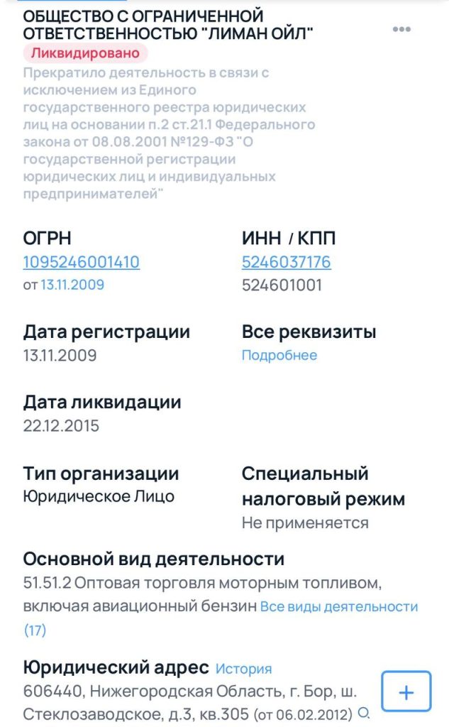 Цікаво, що в 2009 році він створив російський клон українського ТОВ “ЛИМАН ОЙЛ” і був там генеральним директором. Російське ТОВ “ЛИМАН ОЙЛ” займалося оптовою торгівлею моторним пальним, включно з авіаційним бензином. Фірма була зареєстрована в нижньогородській області (рф), та була ліквідована в 2015 році.