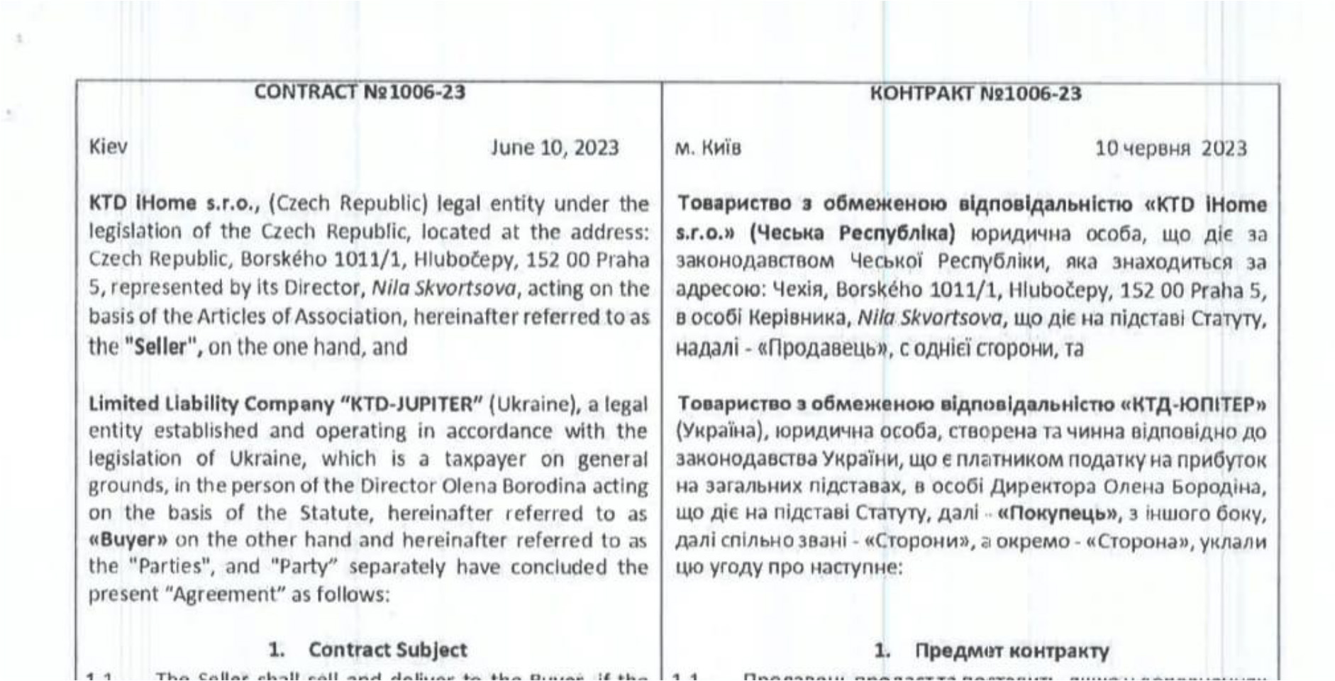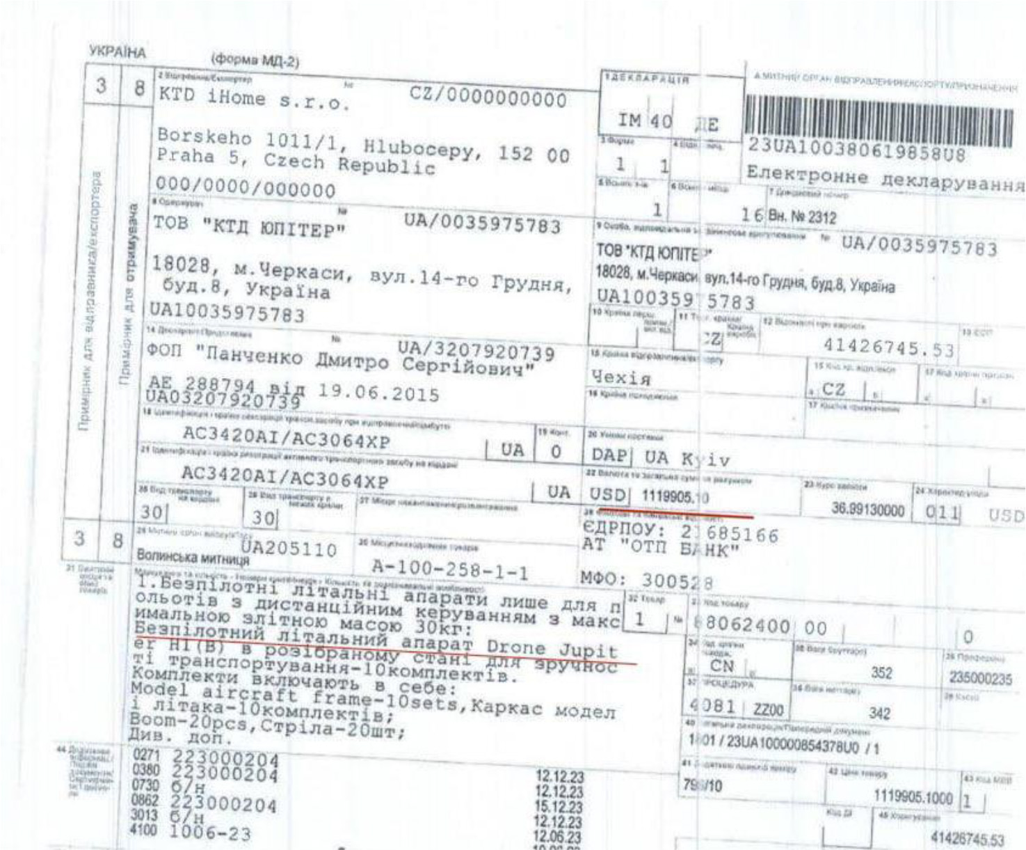 Кінцевий бенефіціар — Олександр Громико, через родича Журжу. З українського боку — ТОВ «КТД-Юпітер». З чеського — KTD iHome. Виглядає як схема виводу коштів, а не реальний оборонний контракт. Один із ключових документів, що підтверджує таку тіньову схему ввезення комплектуючих з Чехії, — це митна декларація № 23UA100380619858U8 від 17 грудня 2023 року. В ній чітко вказано: відправник — чеська компанія KTD iHome s.r.o., отримувач — ТОВ «КТД Юпітер» у місті Черкаси.