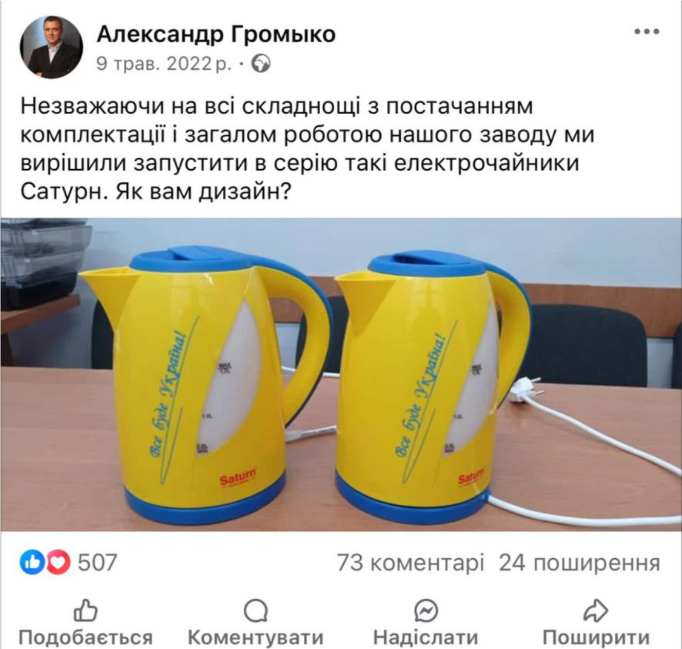 Saturn – відомий українському споживачеві бренд побутової техніки. Його активно позиціонують як національний бренд, представляють як приклад українського виробництва. Інші бренди техніки, якими оперує KTD Group є ST і Laretti. В Україні група і справді мала виробництво в Черкасах та Каневі, але після початку повномасштабної оголосила про “релокацію” своїх виробничих потужностей у ЄС, словацьке місто Стражске. Така релокація мала б відбутись частково за гроші словацького уряду, за програмою Агентства з розвитку інвестицій і торгівлі (SARIO). Умови грантової програми – наявність нового (не більше 2-х років; у компанії Громико устаткування було більше ніж 5-річної давнини й вже як рік простоювало у неналежних умовах у Словаччині) обладнання та наявні ресурси для інвестицій, – Громико заявив про аж 10 млн євро власних інвестицій. Як результат, KTD Slovakia немає у списку отримувачів грантів, грошей їм не дали.