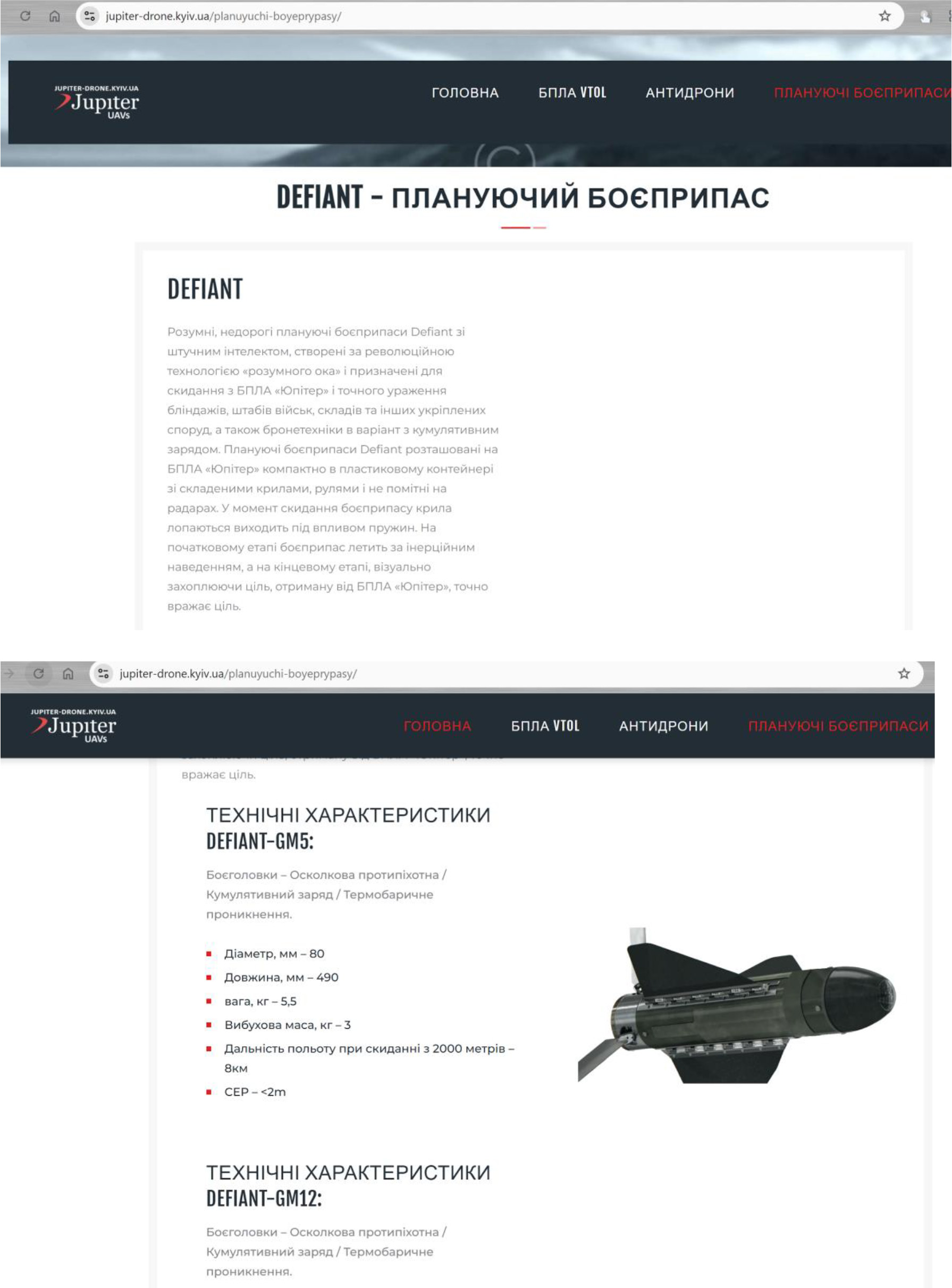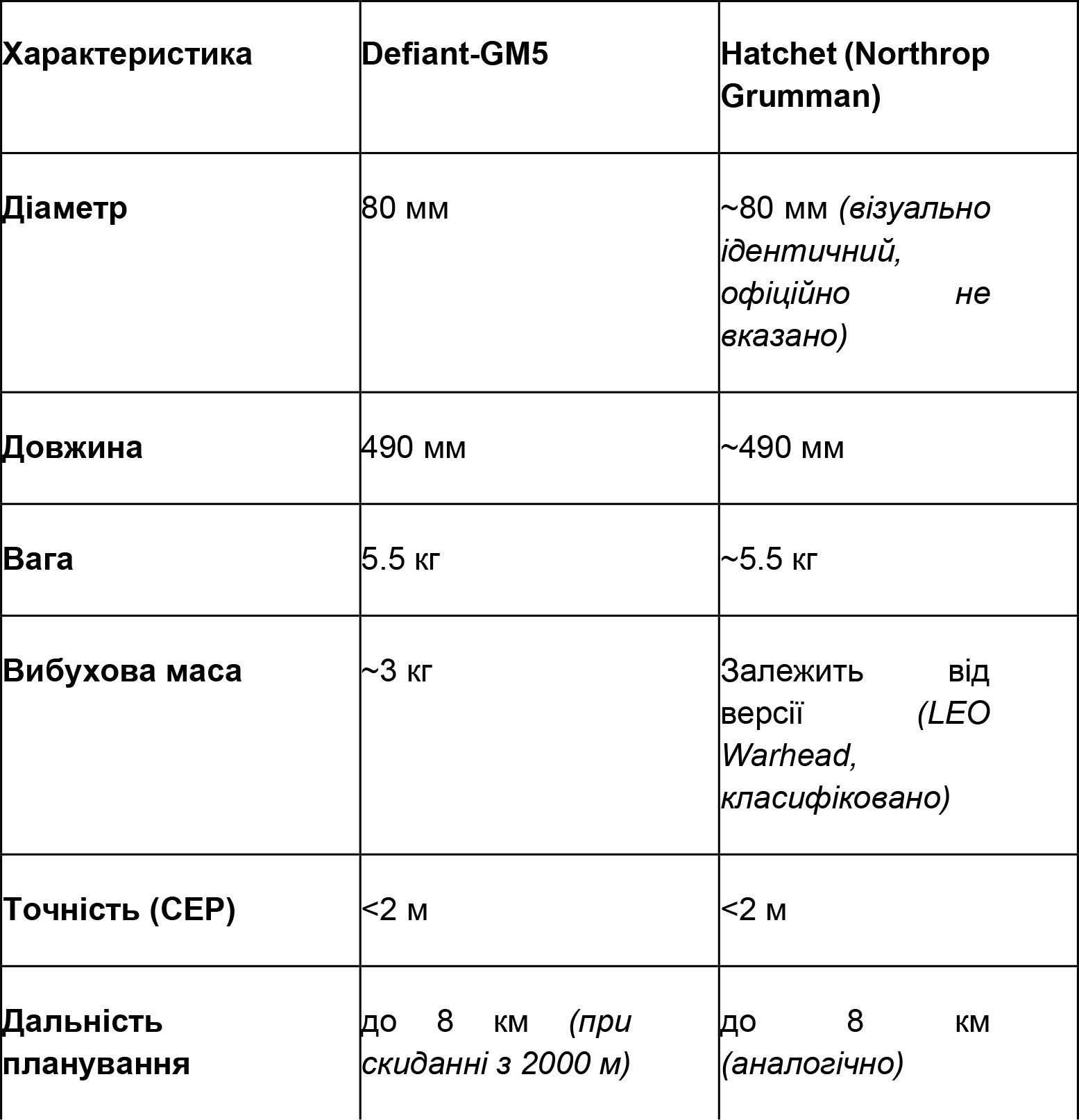 Defiant-GM5 / GM12 — “український” плануючий боєприпас цілком може бути Hatchet: Miniature Strike Munition від компанії Northrop Grumman Corporation. Він має ті самі лінії корпусу, геометрію та навіть таку ж саму демонстраційну візуалізацію на сайті. Копія чужої розробки, переіменована для продаж на українському ринку, яка не потребує розробки власних технологій і виробництва. На сайті пишуть, що компанія нібито розробила два типи плануючих боєприпасів під назвою Defiant. Заявлено про «українське виробництво», унікальні характеристики, адаптацію під вимоги ЗСУ.