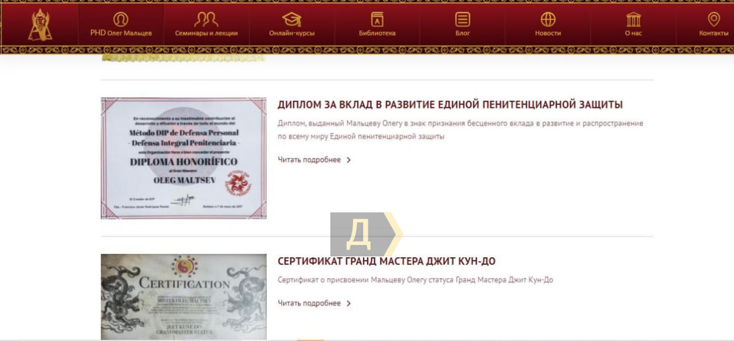 Собственно, крайне сомнительны и другие достижения Олега Мальцева. На своих сайтах он называет себя «инструктором воинских искусство Кали», «гранд-масте»ром Джит Кун До», «академиком Украинской Академии Наук» и прочее, и прочее. Более трех десятков званий и титулов.