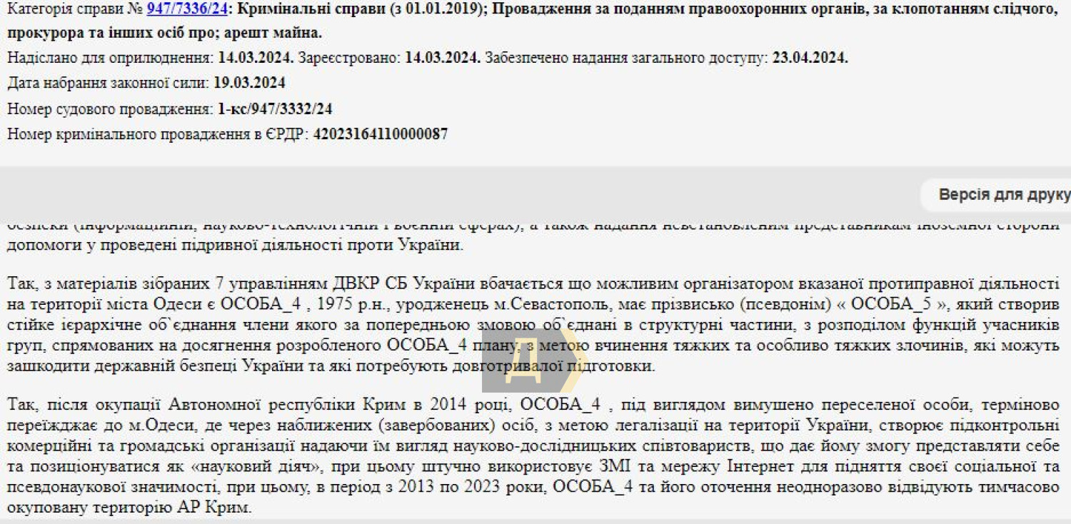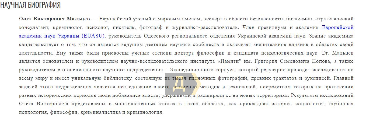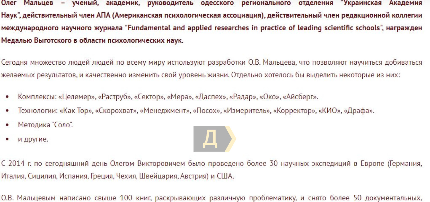 Также в судебных документах идет речь о псевдонаучной деятельности Олега Мальцева. Одна из его организаций называлась Украинской академией наук (настоящая именуется Национальной академией наук Украины).