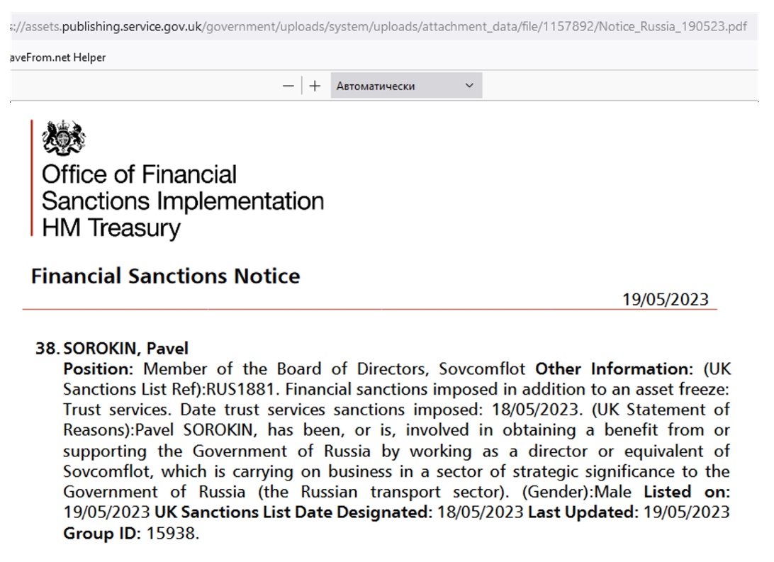 І доки українські санкціонники грають у чиновницький футбол, Британія діє. Співробітники Office of financial sanctions Implementation HM Treasury (Управління з реалізації фінансових санкцій Казначейства Її Величності) внесли до списків санкцій Павла Сорокіна за отримання вигоди від «підтримки уряду Росії, працюючи директором або еквівалентом «Совкомфлот», що здійснює діяльність у галузі уряду Росії (транспортна галузь Росії)».