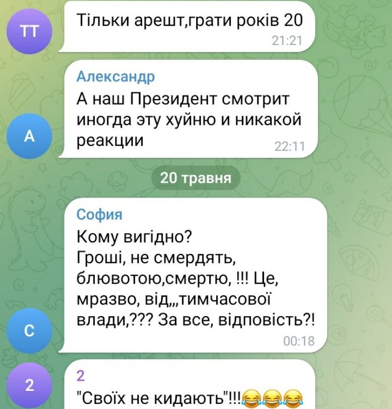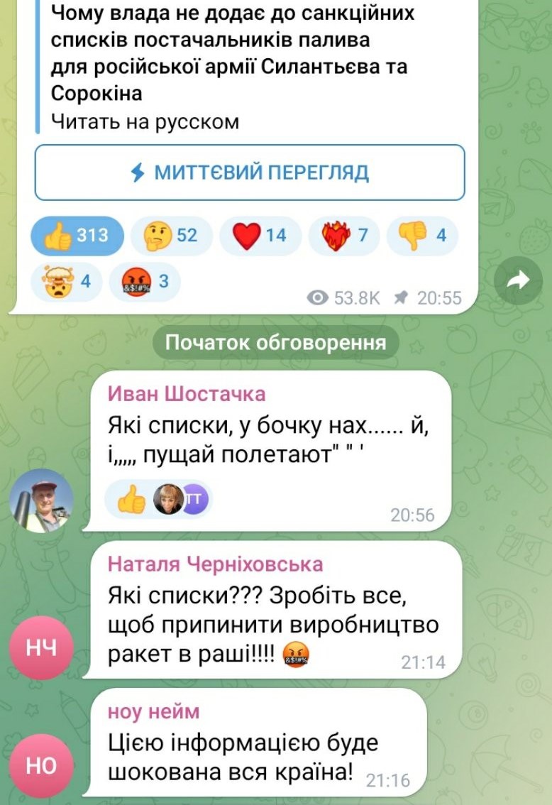 У телеграм-каналах не менш активно обговорювалася бездіяльність влади щодо внесення до санкційних списків російських постачальників нафтопродуктів на окуповані території України. Критика влади була навіть агресивнішою. І до звинувачень у корупції та своячництві РНБО і влади додалися прямі звинувачення президента України Володимира Зеленського.