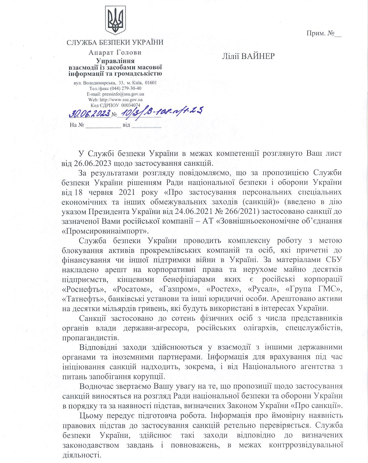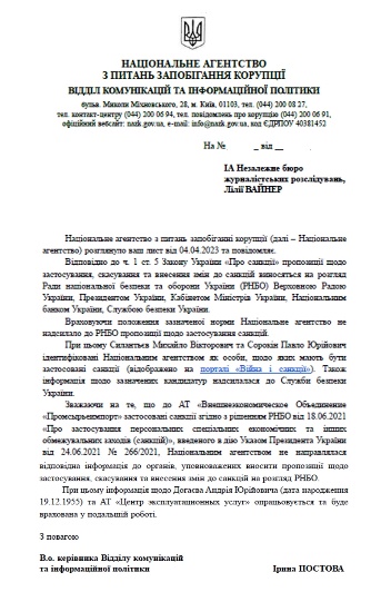 У нас в Україні, на жаль, поки що ці твердження лише на словах. Численні звернення щодо внесення до санкційних списків і до міжнародної групи Єрмака-Макфола та до РНБО, до Комітету ВР з питань національної безпеки, оборони та розвідки поки що не дали результатів. Національне антикорупційне бюро надало інформацію, що опрацювали наше звернення та надіслали відповідний лист до Служби безпеки України.